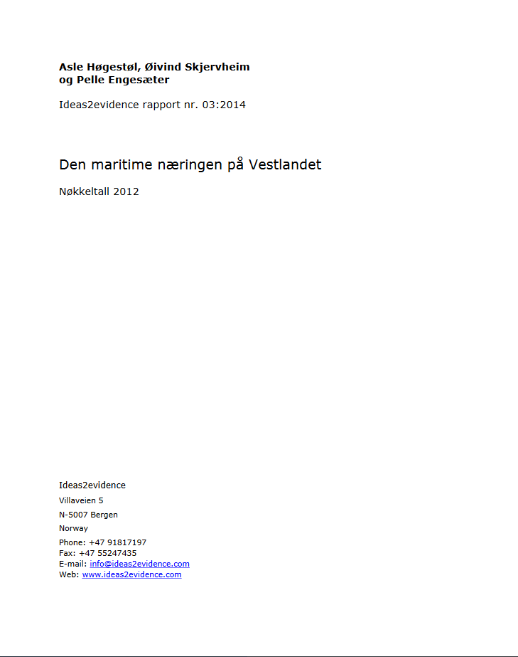 ideas2evidence har på oppdrag fra Vestlandsrådet utarbeidet et sett nøkkeltall for den maritime næringen på Vestlandet. Nøkkeltallene er beregnet for Vestlandet samlet, de enkelte fylkene og kommunene i regionen. Maritim næring er definert som summen av maritim og marin næringsvirksomhet, inkludert den rent maritime delen av oljevirksomheten.